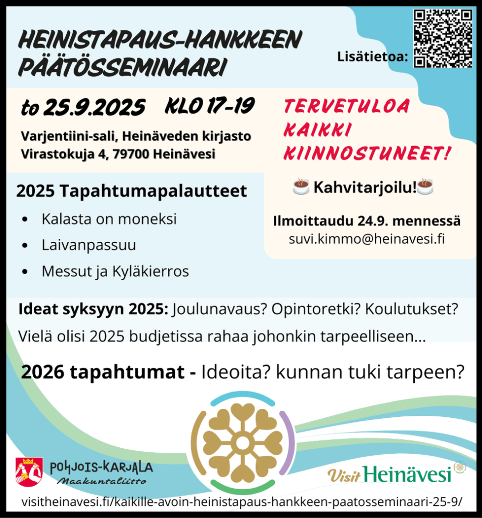 Ensi kesänä Heinävedellä järjestetään kaksi isompaa tapahtumaviikonloppua, kesäkuun ja heinäkuun lopussa, jolloin paikkakunnalle odotetaan vieraita myös kauempaa. Näiden rinnalle halutaan kehittää kylien omia tilaisuuksia, oheisohjelmaa ja yhteistoiminnallisia aktiviteetteja, jotka vahvistavat Heinävettä elinvoimaisena ja viihtyisänä paikkana niin asukkaille kuin matkailijoille. Tapahtumia järjestävät toimijaryhmät saavat jatkossakin tukea myös taloudellisesti, ja budjettia on varattu sekä koulutuksiin että tapahtumien toteuttamisen tukemiseen (esim. markkinointi). Vielä tämän vuoden puolella voidaan toteuttaa yhteisiä tilaisuuksia, koulutusta tai vaikka pieni opintoretki. Olisiko teillä ideoita erityisesti joulun seutuun, jotta voisimme luoda yhdessä hyvää joulumieltä kaikille?